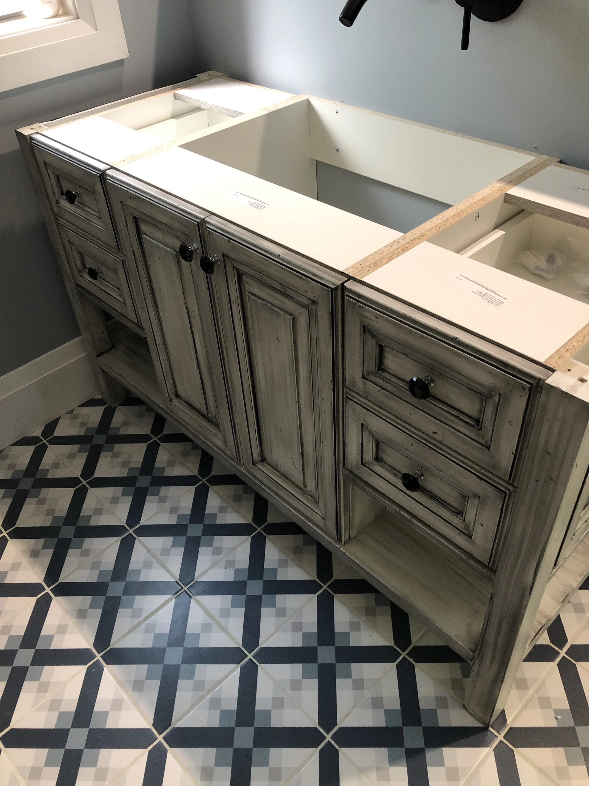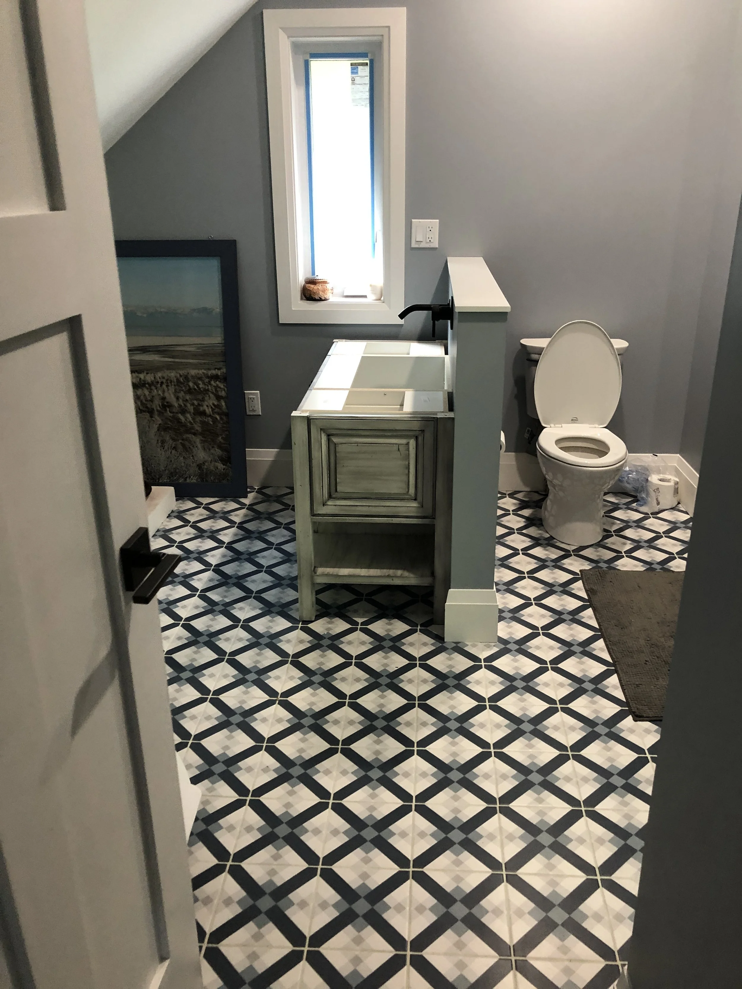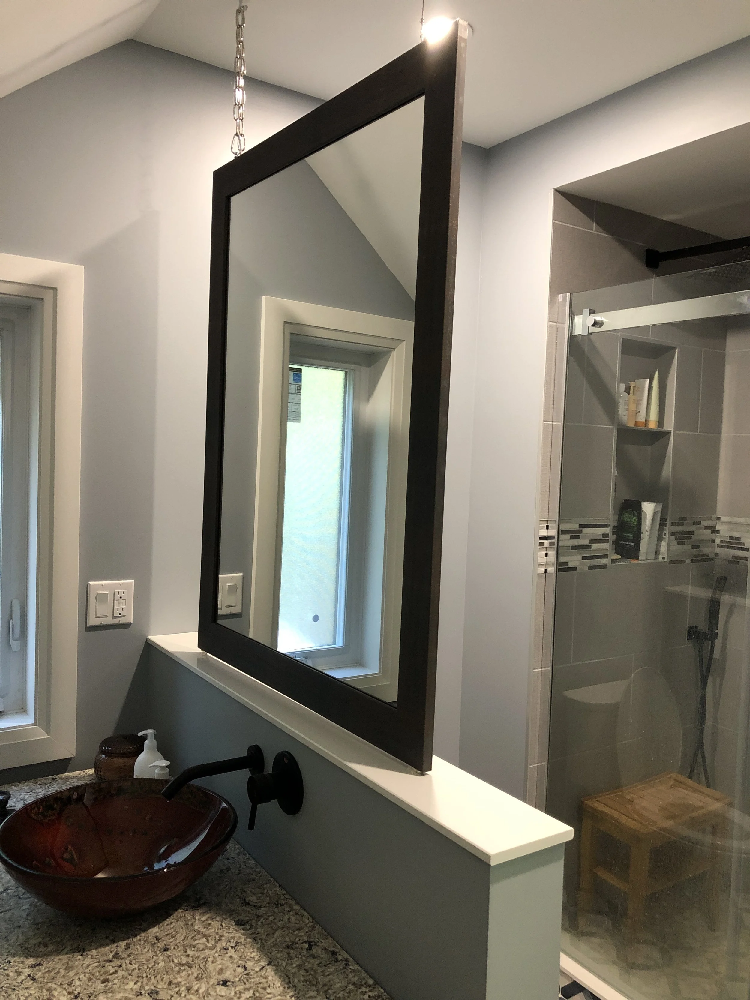With a custom-made vanity centred in the room and a mirror suspended from the ceiling separating the massive walk-in shower from the tub, this unique ensuite bathroom needed heated flooring to make it the complete oasis we were looking for. (The tile is called “Tesseract”.)
