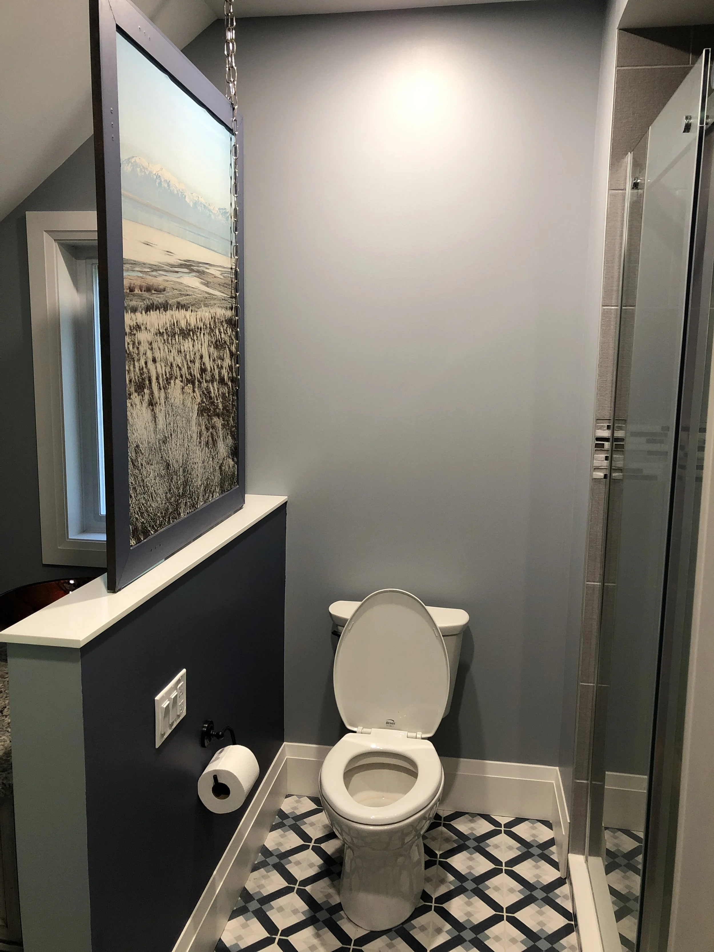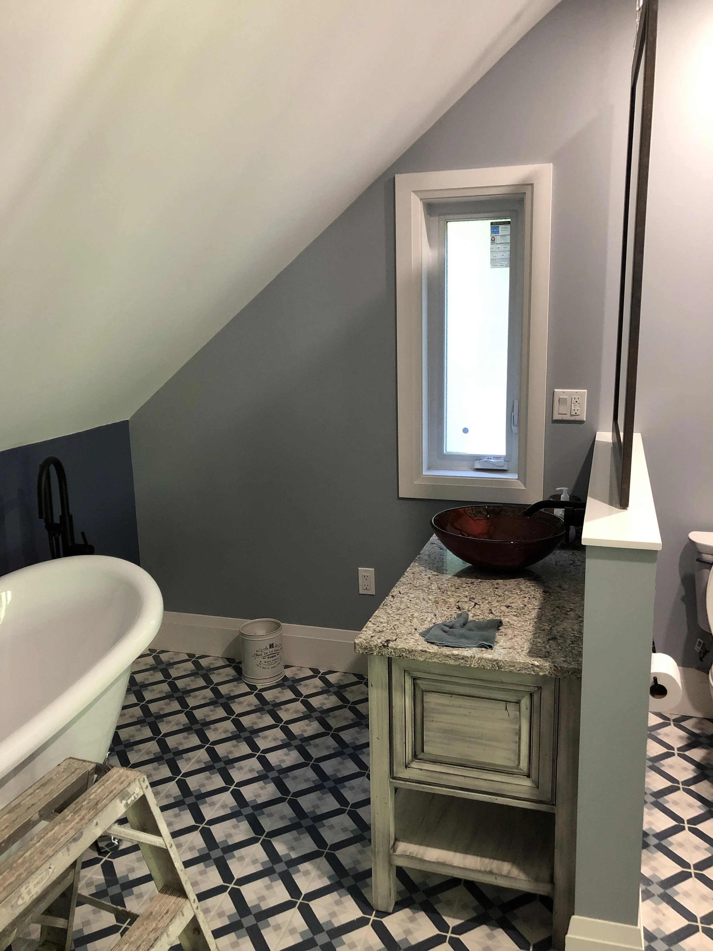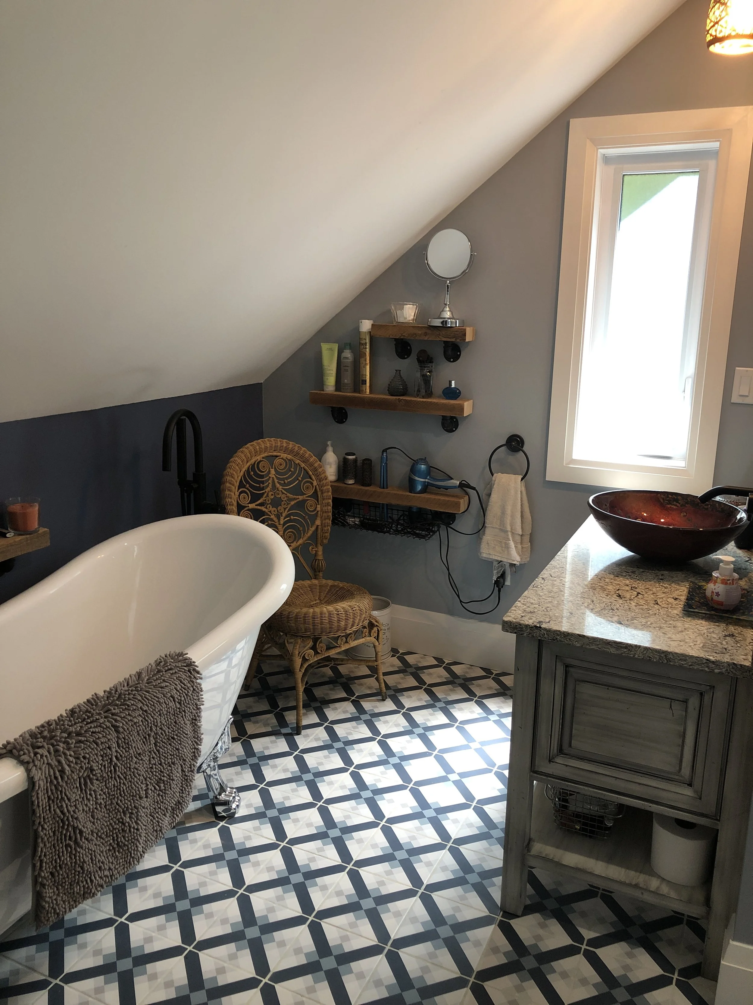 A bathroom with a heated floor, standalone tub and slanted ceilings: a Sweet Ensuite!